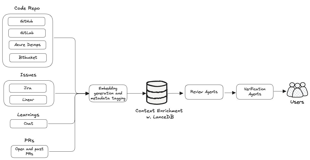 LanceDB ingests and indexes data from diverse sources: - Code structure: captures both syntactic and semantic structure. - Issue trackers: Jira and Linear tickets provide intent and problem context. - Historical reviews: Past pull requests and decisions enable pattern recognition